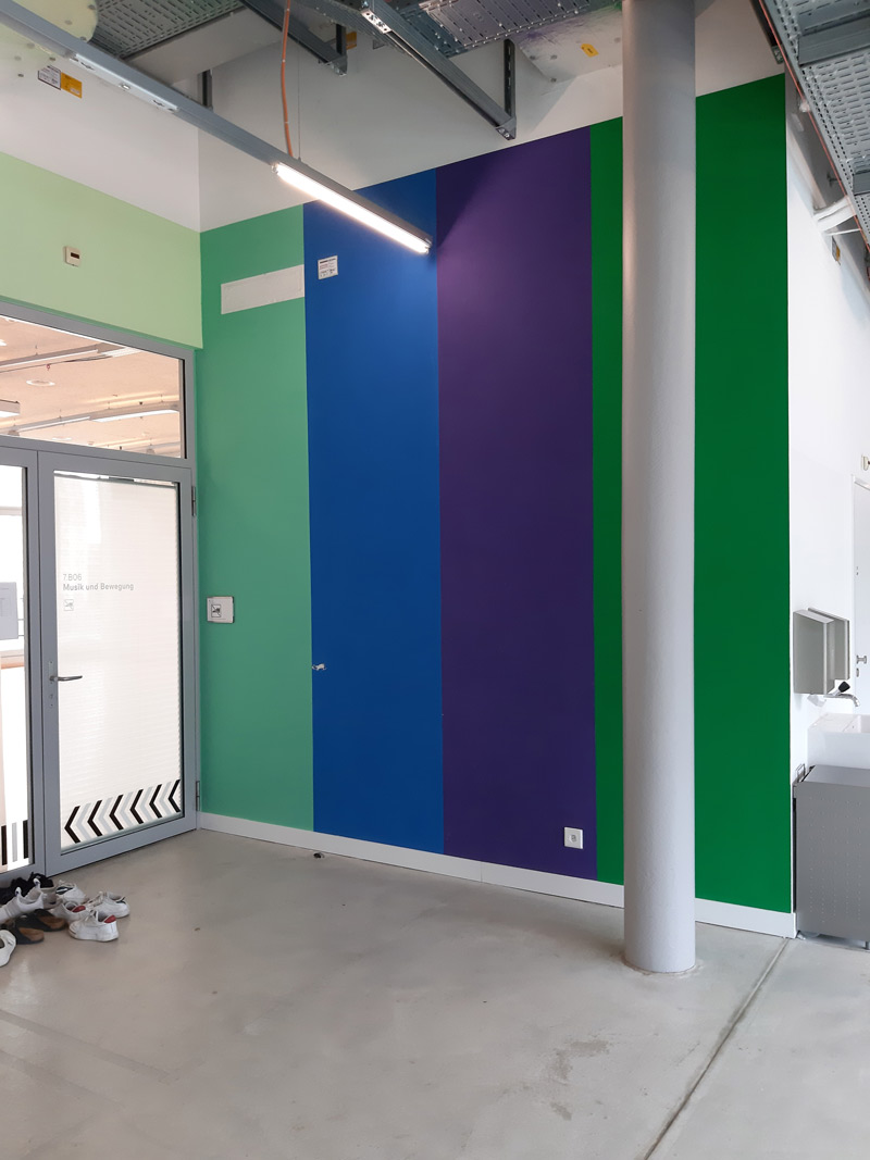 Verlässt man im riesigen, massiven Industriebau der Zürcher Hochschule der Künste die zentrale Kaskade, findet man sich bald in einer Anlage von langen, eintönigen Gängen wieder, in denen man schnell die Orientierung verliert. Die Ebene 7 ist anders. Die Bereiche Tanz, Musik und Bewegung stellen eine lebhafte Umgebung dar. Das Leben der Studierenden spielt sich auch in den Gängen, zwischen den Studios ab. Es wird geübt, gewartet, der Schneider kommt mit den Kostümen vorbei, manchmal ist live Musik zu hören. Das Farbkonzept von Chroma-Studio bildet eine atmosphärische Kulisse mit abwechslungsreichen und intensiven Farbstimmungen, vor der sich das pulsierende Kommen und Gehen zwischen den Studios und Übungsräumen abspielt. Die Umgebung ist anregend und inspirierend und vermag auch an düsteren Tagen eine Heiterkeit hervorzuzaubern.